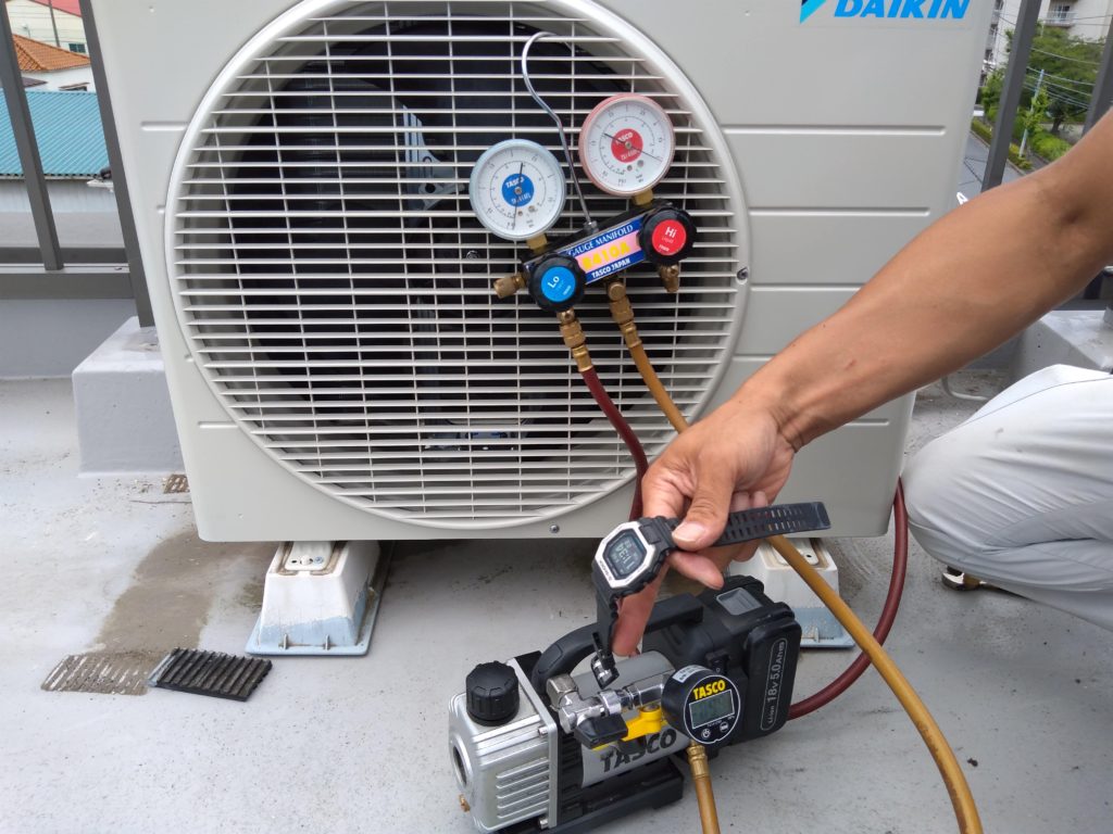 室内機を取り付けその後室外機の冷媒ガスの漏れがないか?などなどチェックし試験運転 問題なく冷房が効いているのを確認したら作業終了!お疲れさまでした