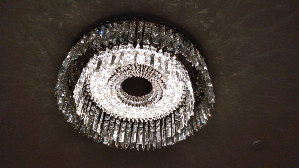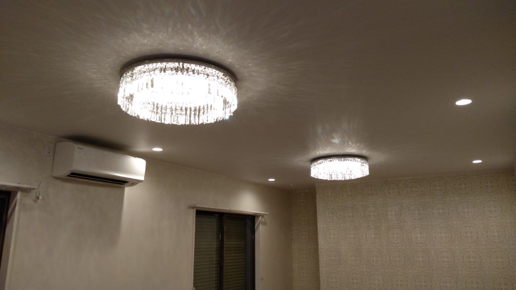ブログ担当の根本です。リビングルームの照明の取り付けを行いました 豪華きらびやかですがパーツが多く一つ一つ吊り下げるので大変手間がかかります。。首が痛くなってきます。